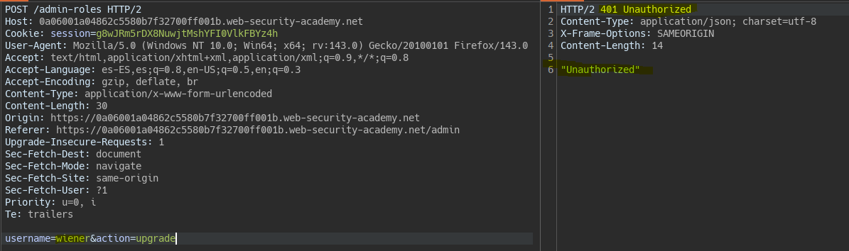 Trying to elevate privileges for user Wiener, the server responds with “Unauthorized”.