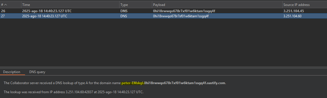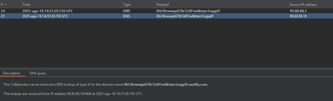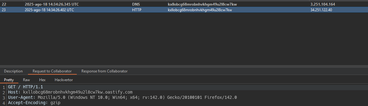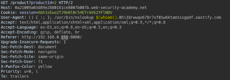Para ver el output del comando ‘whoami’, podemos hacer uso de la función ‘$() como si fuera un subdominio de nuestro burp colaborator.
