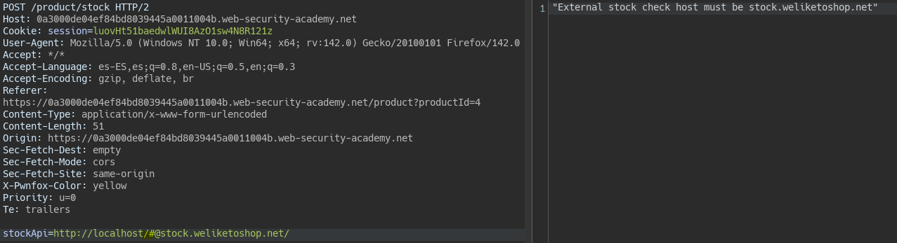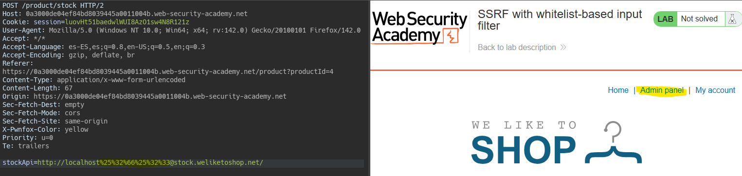Para que la web nos interprete la url ‘localhost’, podemos hacer uso del hash ‘#’, el cual convertiría el dominio requerido por un directorio ‘vacío’ /#stock.weliketoshop.net. De esta forma respetamos la sintaxis de la autenticación permitida. Para que la web interprete el ‘/#’ como parte de la misma url, tenemos que hacer un doble URL encode.